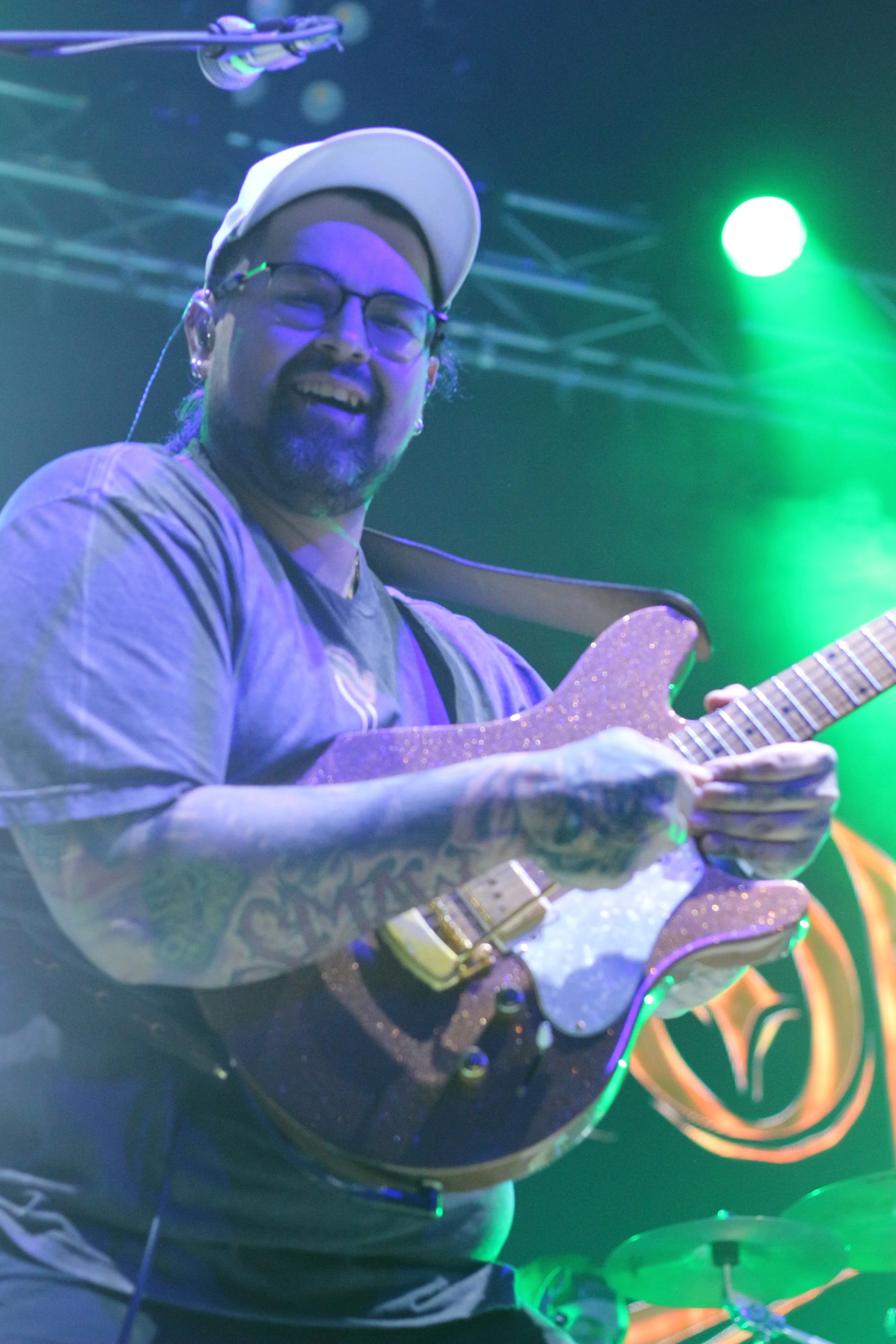 A man with glasses, a baseball cap, and tattoos playing a glittery guitar on stage under green stage lights.