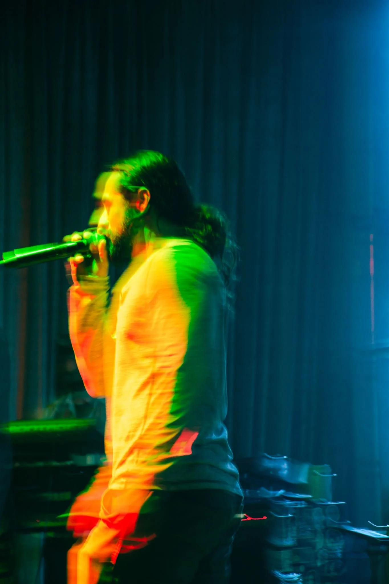 A man with long dark hair and a beard is singing into a microphone on stage, with colorful lighting creating a blurred, psychedelic effect.
