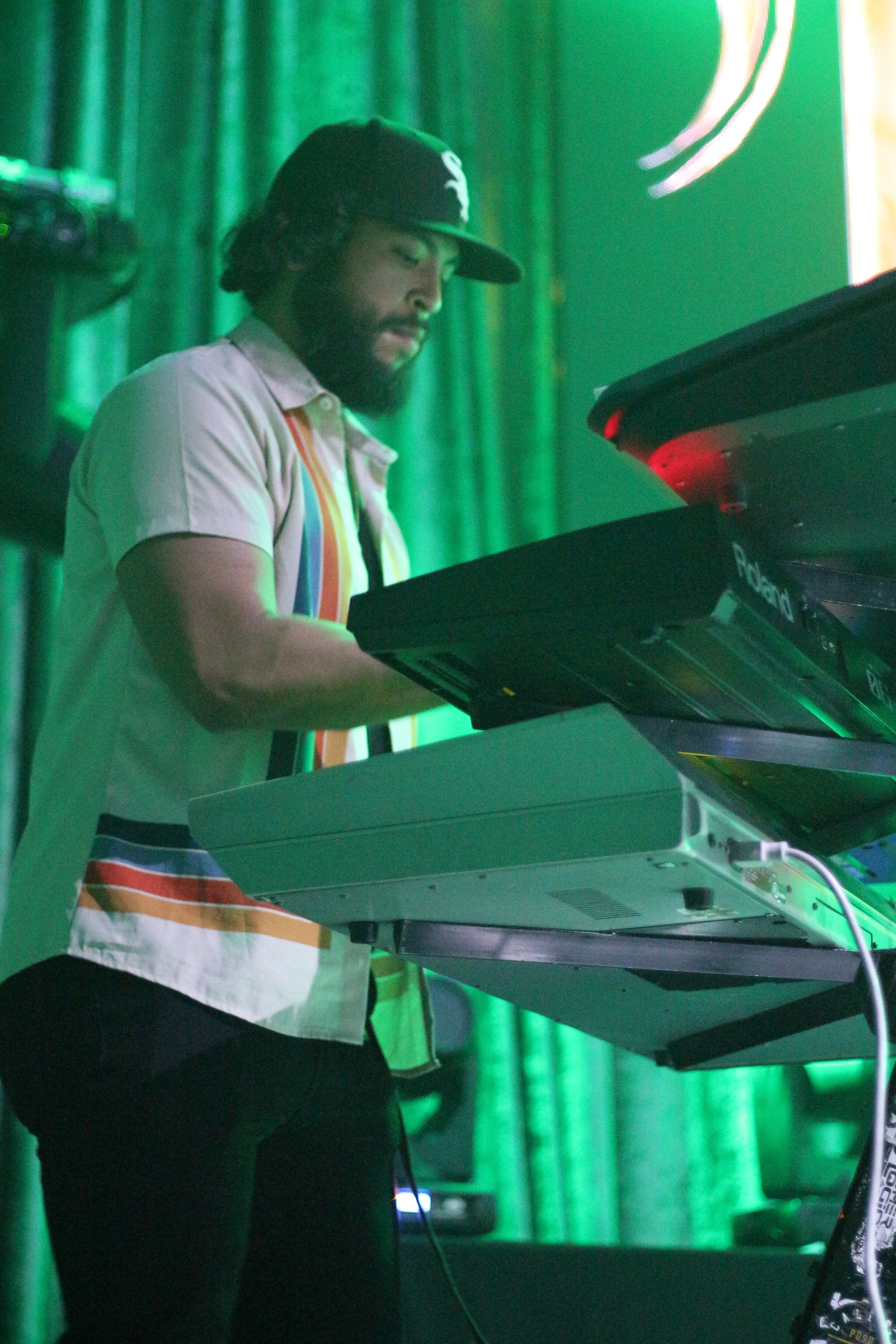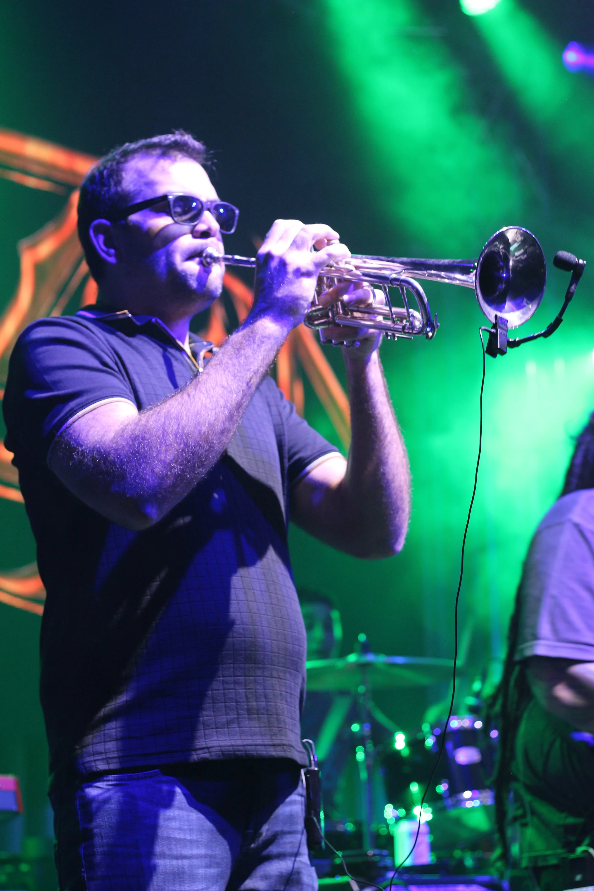 A man playing a trumpet during a live music performance on stage with green and purple lighting.